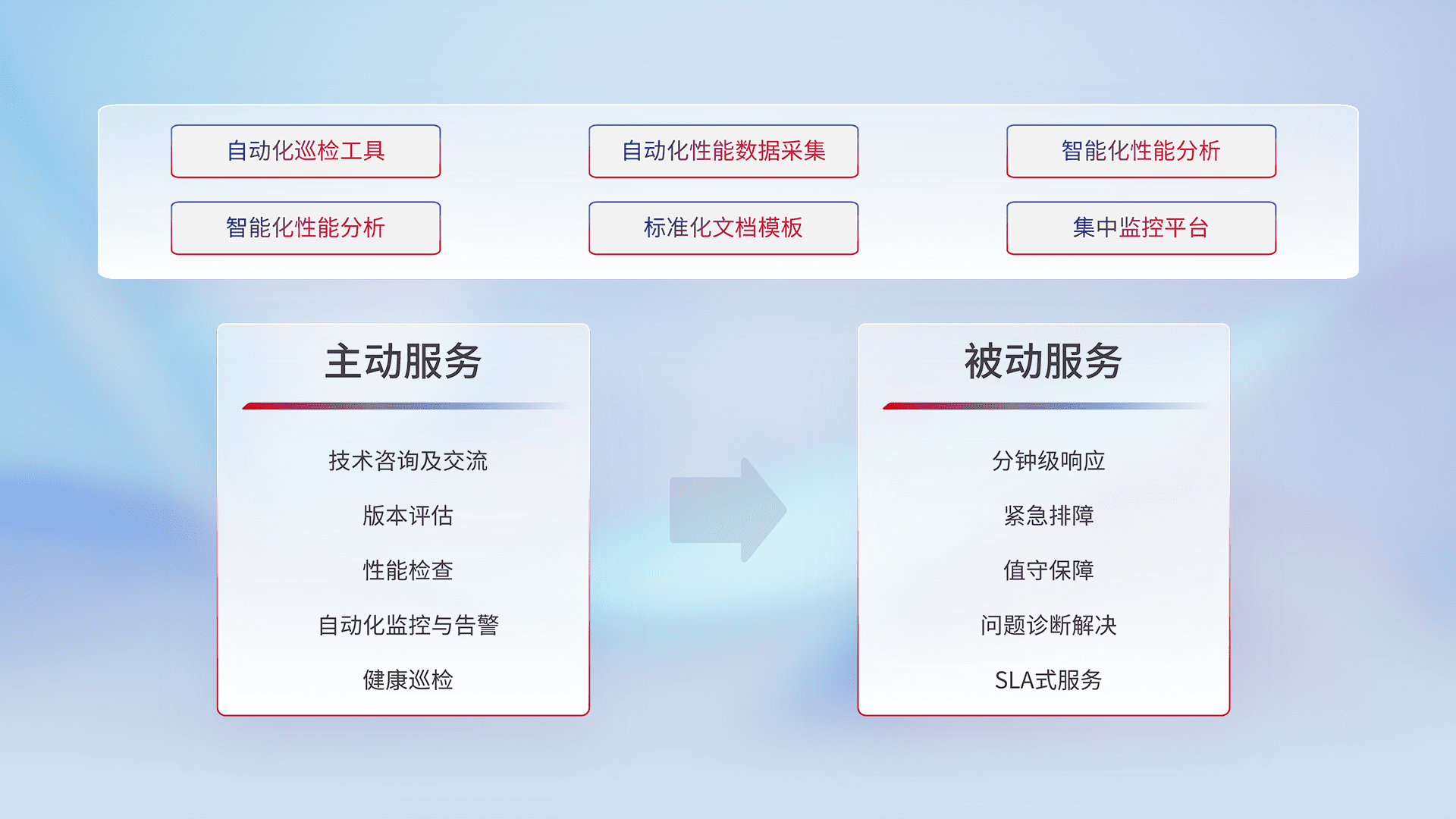智能化工具和标准化文档,,,,保障服务质量,,,,提供主动服务(包含技术咨询、、、、版本评估、、、、性能检查、、、自动化监控与告警、、健康巡检)和被动服务包含(分钟级响应、、、紧急排障、、、、值守保障、、、问题诊断解决、、SLA服务)。。。